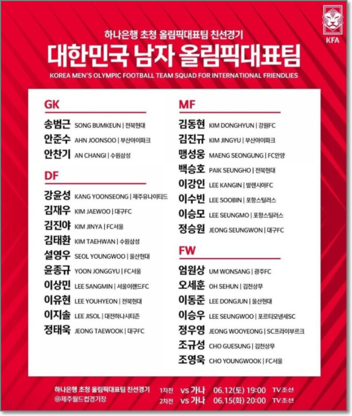 올림픽대표팀은 6월 12일과 15일 제주에서 가나 올림픽 대표팀과 평가전을 갖습니다. 이승우, 이강인, 백승호, 정우영, 이동준이 포함되었으며 해당 중계는 TV 조선과 쿠팡플레이에서 생중계로 시청 가능합니다.