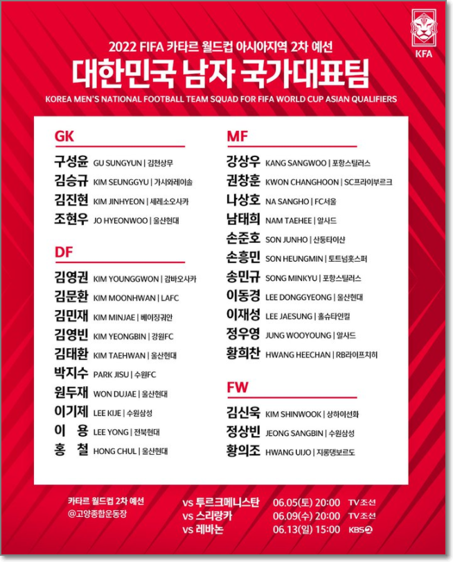 한국 레바논 중계 2022 카타르 월드컵 2차 예선경기가 치뤄지고 있는 가운데 오늘 한국과 레바논의 H조 경기가 있습니다. 2021년 06월 13일 일요일 오후 3시 고양종합운동장에서 펼쳐지는데요. 해당