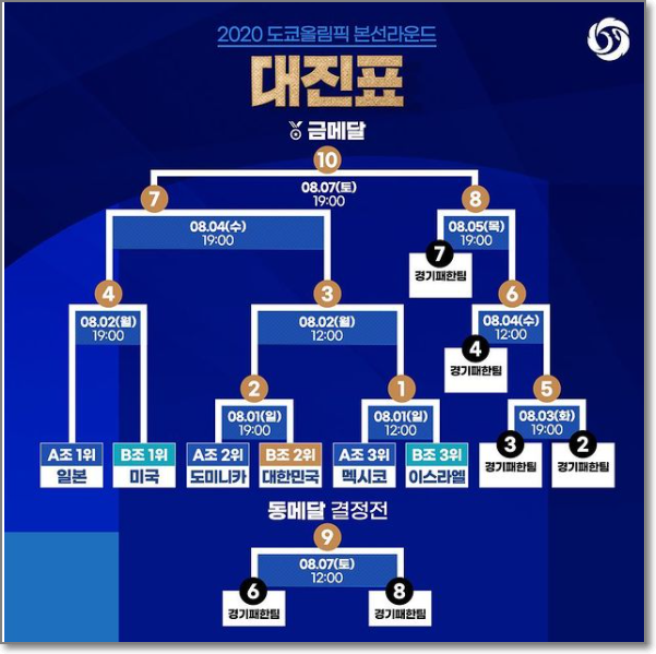 대한민국은 조2위로 도미니카와 경기를 해서 승리했고 준결승 4강에 진출했습니다. 일본과 맞붙게 됩니다. 이 경기의 승자가 8월 7일 결승전으로 직행합니다. 만약 패하면 8월 5일에 패자부활전으로 올라온 팀과 맞붙어서 결승 진출을 다투게 됩니다. 져도 결승진출을 위한 기회가 또 한 번 있습니다. 일본이 만든 꼼수입니다.