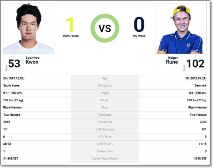 당시 권순우의 랭킹은 81위, 루네의 랭킹은 321위였습니다.
