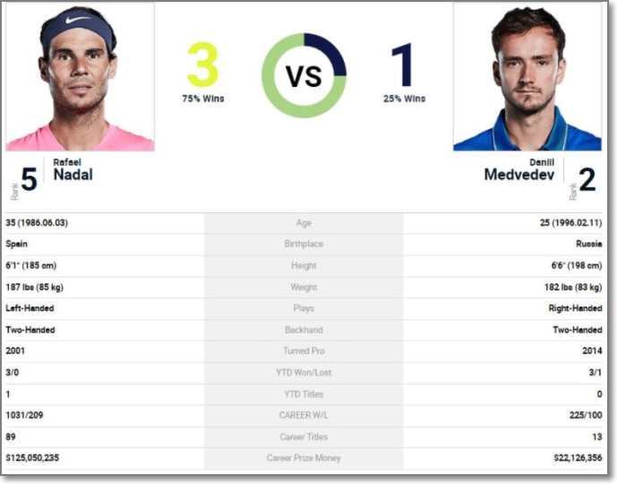나달이 3승 1패로 앞서지만 2019년 3번의 대결에서 나달이 이겼고 마지막 만남인 2020년에는 메드베데프가 이겼고 그 후 메드베데프의 실력 향상을 볼 때 좋은 승부가 예상됩니다.