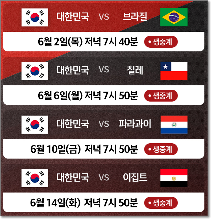 6월 14일 저녁 8시에는 대한민국 이집트의 친선 경기가 있습니다. 서울 상암 월드컵 경기장에서 열리며 자세한 시청 방법은 아래를 참고하세요.