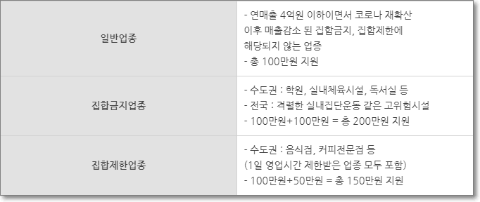 집합금지업종 소상공인 : 200만 원 지원(새희망자금 기본 100만 원 + 추가 100만 원)