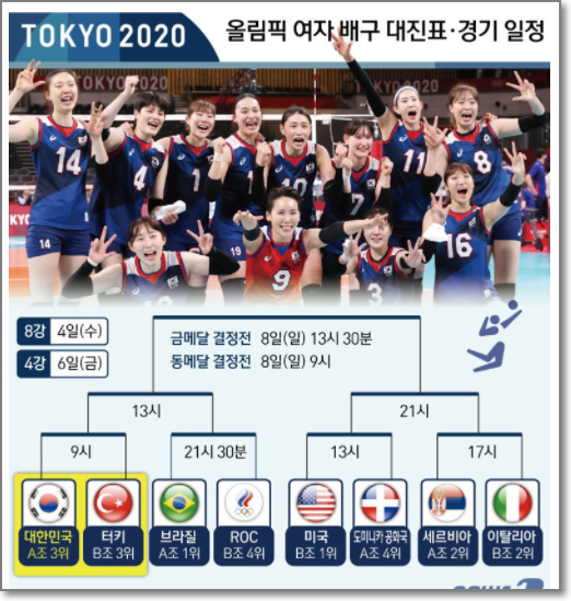 한국 여자배구 대표팀이 터키를 꺾고 4강 진출을 확정했습니다. 이제 본격적인 4강전에 돌입하는데요. 4강 맞대결 상대는 브라질입니다. 아래에서 이번 여자배구 결승 대진표와 경기일정, 그리고 시청 방법을 확인 바랍니다.