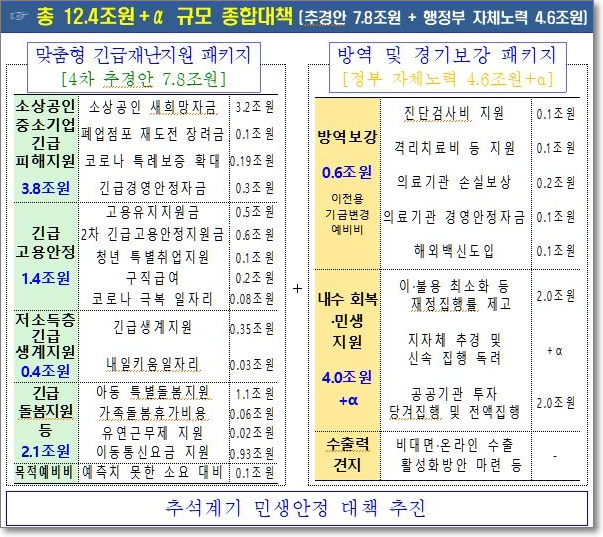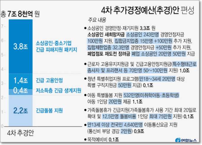정부는 긴급대책으로 7조 8000억원 규모의 4차 추경을 편성했습니다. 피해가 가장 큰 업종과 직종에 집중해 최대한 두텁게 지원하는 피해맞춤형 재난지원 성격의 추경인데요.
