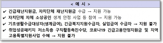 생계급여, 긴급복지지원금, 실업급여, 취업성고패키지 구직활동촉진수당, 코로나19 긴급고용안정지원금을 받은 사람은 제외됩니다.