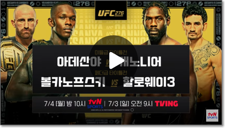 UFC 276 경기는 티빙에서 독점 생중계합니다. 티빙 한달 무료 이용을 통해 해당 경기를 무료 시청 가능합니다. 자세한 시청 방법 아래를 참고하세요.