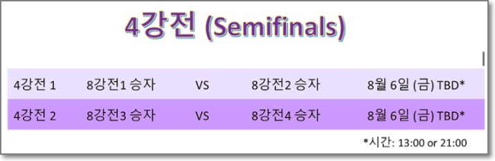 8월 6일 오후 1시 세르비아와 미국의 승자와 오후 9시 대한민국과 브라질의 승자가 결승전에서 만납니다.