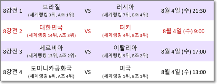 8월 4일 오전 9시에 대한민국 터키의 8강 경기는 대한민국의 승리로 확정되었습니다. 이제 남은 경기 안내드립니다.