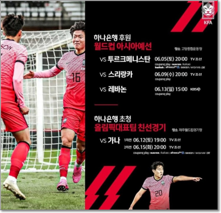 오랜만에 한국 남자 축구 대표팀의 경기를 볼 수 있게 되었습니다. 6월 한달 동안 5경기를 치룰 예정이라 축구 팬들의 관심이 집중되고 있는데요. 자세한 경기 일정과 시청 방법에 대해 안내드리겠습니다.