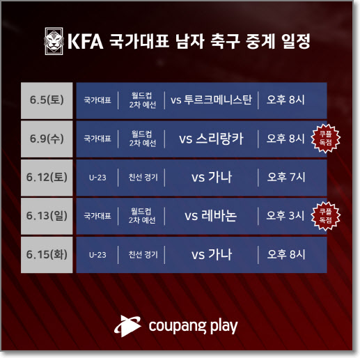 13일 레바논전은 쿠팡플레이가 디지털 독점 생중계를 합니다. TV 시청이 어려운 분들은
