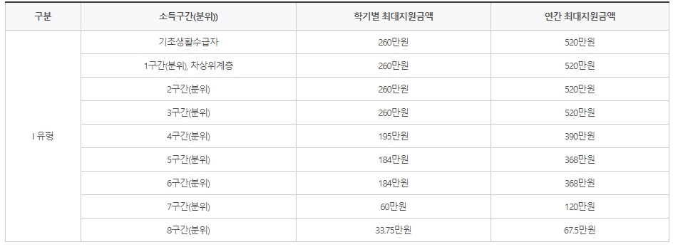 기초생활수급자와 차상위계층, 그리고 1분위부터 3분위까지는 연간 최대 520만원, 학기별로 최대 260만원의 장학금을 받을 수 있습니다. 4분위는 195만원, 5분위 6분위는 학기별로 최대 184만원을 지원받고 7분위는 학기별 최대 60만원입니다. 8분위는 학기별 최대 33만7천원정도 받습니다.