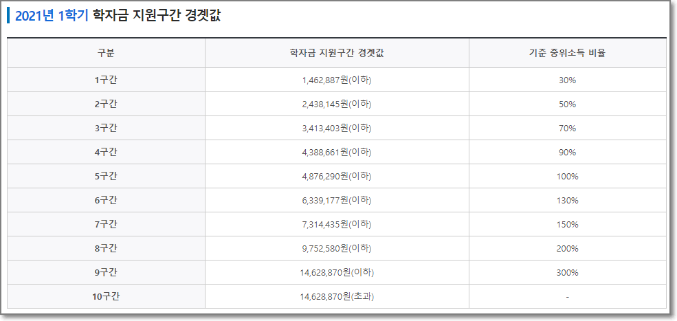 학자금 지원을 위한 소득구(분위) 경곗값을 확인해 보세요.