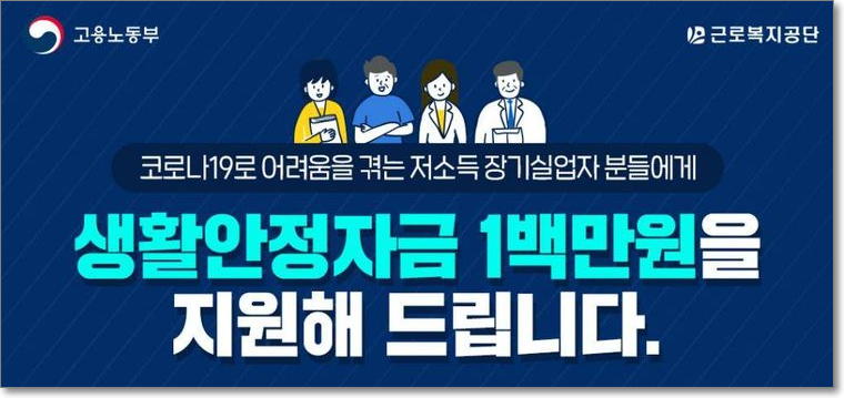 고용노동부와 근로복지공단에서는 코로나19 장기화로 생계의 어려움을 겪고 있는 장기실업자를 대상으로 생활안정과 재취업 촉진을 위한 저소득 장기실업자 생활안정자금 지원사업을 시행합니다.