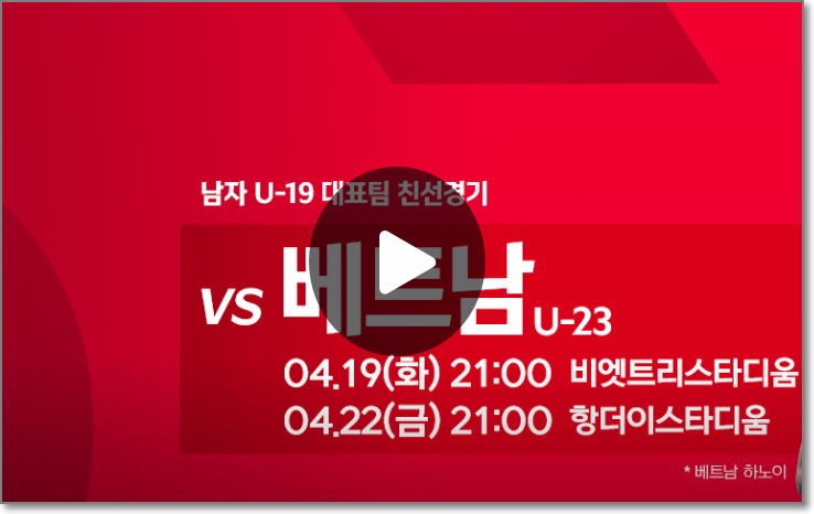 한국 U19 축구 대표팀은 베트남 U23 대표팀과 두 차례 친선 경기를 갖습니다. 4월 19일, 22일 저녁 10시에 펼쳐지는데요. 자세한 시청 안내드리니 아래를 참고 바랍니다.